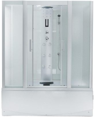 комплектация: верхний душ с эффектом тропического ливня(d лейки 240мм); принудительная вентиляция; радио FM диапазон; верхнее освещение; декоративная подсветка,-лунный свет; сенсорная панель управления электроникой; возможность принимать телефонные звонки; регулируемый по высоте ручной душ на штанге; гидромассаж спины; зеркало; полка для туалетных принадлежностей; откидное полириутановое сидение; подголовник; слив/перелив.