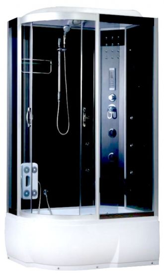 комплектация: верхний душ с эффектом тропического душа; принудительная вентиляция; радио FM диапазон;декоративная светодиодная подсветка на центральной панели; полка для туалетных принадлежностей; ручной душ регулируемый по высоте; 3 большие гидромассажные форсунки; гидромассаж ступней ног; сиденнье.