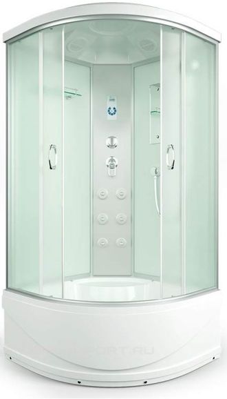 комплектация: верхний душ с эффектом тропического ливня; принудительная вентиляция; радио FM диапазон; верхний свет; декоративная подсветка на центральной стойке; сенсорная панель управления "электрикой"; гиромассаж спины-6г/м форсунок; ручная лейка-душ; 3-х режимный смеситель(латунный); полка для туалетных принадлежностей; зеркало; литое в поддоне сиденье;