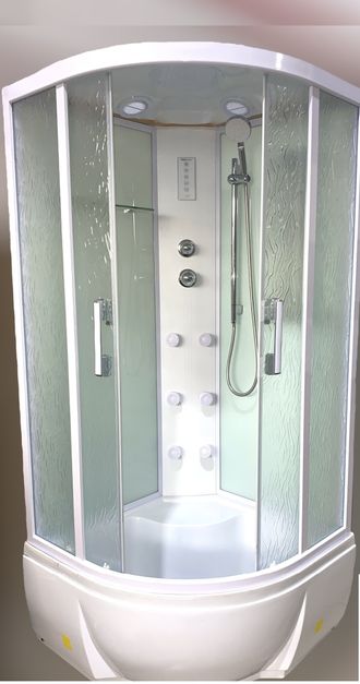 комплектация: верхний душ(стационарный с эффектом тропического ливня); принудительная вентиляция; верхний свет; радио FM диапазон; сенсорный пульт управления; зеркало; стеклянная полка для туалетных принадлежностей; гидромассаж спины; литое сиденье в поддоне.