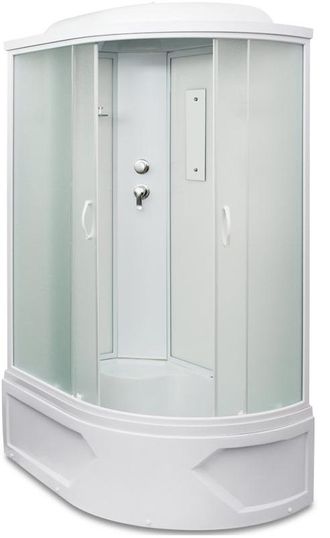 Асимметричная душевая кабина Mirwell, модель MR3512-C1(R/L) с размерами 1200*800*2200мм на высоком, h 42см, акриловом поддоне со съёмным фронтальным экраном.. Каркас поддона изготовлен из оцинкованного железа, не подвеженного коррозии. Каркас имеет все предустановленные крепления для монтажа, а также ножки регулирующиеся по высоте( позволяют нивелировать неровности пола). Видимая часть поддона выполнена из сантехнического акрила и выдерживат нагрузку до 370кг. В производстве кабин Mirwell используется только термически закаленное, травмобезопасное стекло. Передние стёкла, дверцы кабины MR3512TP-C1)R/L матовые. Задние стекла- белые,непрозрачные.