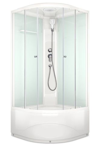 комплектация: верхний душ с эффектом тропического ливня(уникальная система, которая смешивает воду и воздух, создавая эффект дождя); ручная,многорежимная лейка; секлянная полка для туалетных принадлежностей; 2-ух режимный смеситель(латунь); сифон с гидрозатвором; литое сиденье в поддоне.