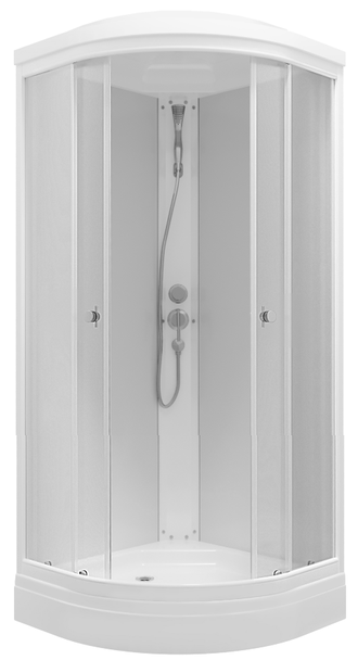 комплектация: верхний(стационарный) душ с эффектом тропического ливня; душевой набор ДН1 в т.ч. ручной душ, 2-ух режимный смеситель (латунь); сливной сифон, d 90mm;