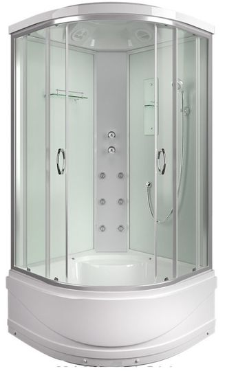 Гидромасажная душевая кабина Mirwell, арт. MRL 903-31 (900*900*2150мм) на высоком акриловом поддоне ( h 420mm) со съёмной лицевой панелью и литым сиденьем. Поддон кабины, выдерживающий нагрузку до 340кг, установлен на усиленном металическом каркасе с регулируемыми по высоте ножками позволяющими невелировать неровности пола. Задние стенки кабины с силиконовым уплотнителем впрессованы в алюминиевый профиль в заводских условиях, что позволяет использовать герметик точечно,- только при установке смесителя, сифона. Это значительно упрощает сборку, а также сокращает время, отведенное на монтаж и установку душевой кабины.