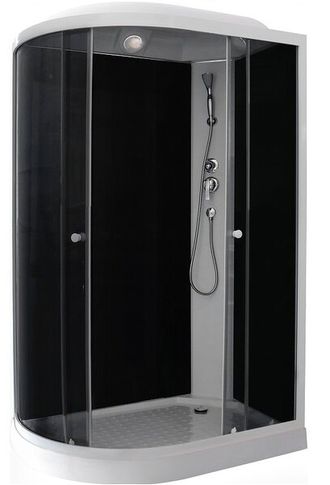 Душевая кабина "PARLY" серия Bianco (эконом), модель EС1231(L/R) с размерами 1200*800*2100мм на низком акриловом поддоне установленном на металлическом(оцинковка) каркасе с регулируемыми по высоте ножками и со съёмным декоративным экраном. Передние стёкла тонированные, задние черные (непрозрачные). Данная модель кабины поставляетс так же и с матовыми стеклами