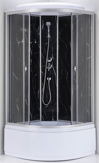 Душевая кабина Водный Мир, модель ВМ 881 (900*900*2150мм) на высоком, по высоте (h-42см), акриловом поддоне со съёмной фронтальной панелью, установленная на металлическом каркасе с регулируемыми по высоте ножками. Кабина имеет максимальный полезный объём для данного размера. Задние стекла выполнены из акрилового стеклопластика имитирующие по цвету либо черный, либо белый мрамор. Предние травмобезопасные стекла,- прозрачные.